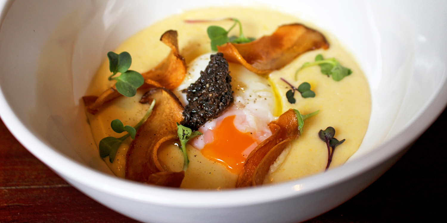 Entrada do novo menu do Forquilha: Ovo mole com polenta cremosa, mandioquinha frita e creme de trufas (R$ 30)